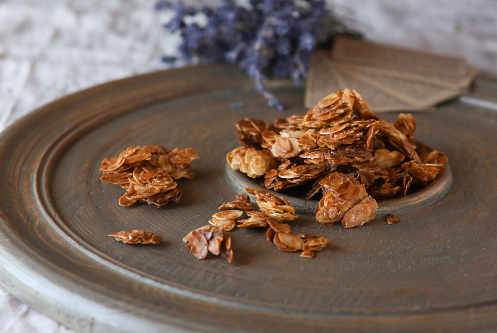 Sudėtis iš ekologiškų produktų: migdolų dribsniai, datulių sirupas, kiaušinis, rankomis rinkta druska iš Prancūzijos. Mūsų dėžutė 150 g.